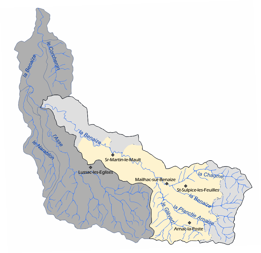 Le Syndicat intervient sur la partie amont de son bassin versant, soit un secteur de 270 km² dont 170 km² en Haute-Vienne. Ce territoire comprend 126 km de cours d’eau, dont 45 km de Benaize.