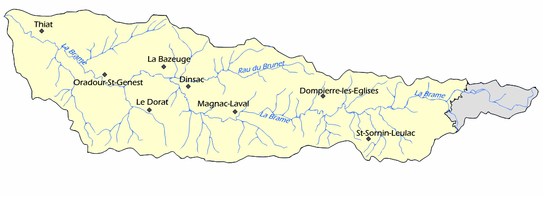 La Brame prend sa source, à environ 400 mètres d’altitude, sur la commune de Saint-Maurice-la-Souterraine (Creuse). Son bassin versant, entièrement géré par le SMABGA, s’étend sur 270 km² et compte plus de 350 km de cours d’eau qui s’écoulent vers l’ouest, des reliefs élevés vers les plateaux de la Basse Marche.